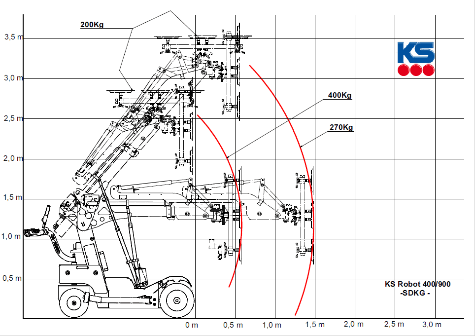 Le Robot KS 400 est le plus jeune de la famille des KS Robots. Il résulte de la combinaison d’une expérience de nombreuses années de mise en œuvre avec le savoir faire technique des concepteurs produits chez KS. Il devait être à la fois compact et maniable, de manière à pouvoir également être bien utilisé dans des couloirs étroits ou pour le passage à travers des portes étroites. Il devait pouvoir manipuler et poser des éléments de toutes les dimensions et catégories de poids courantes. De plus il devait offrir un grand déport vers l’avant et en hauteur, afin d’être équipé pour tous les types d’application. Le résultat en vaut la peine: un appareil de première classe, techniquement au point, pour des charges jusqu’à 400 kg et un bras télescopique extra long de 900 mm et qui, grâce à sa construction compacte montre sa force, en particulier dans les endroits à dimensions réduites.